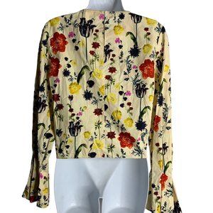 H&M Floral Bell Sleeve Crop Top 4 Beige Tie Front Key Hole Button Round Neck