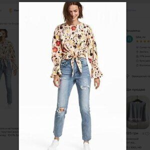 H&M Floral Bell Sleeve Crop Top Beige Tie Front Key Hole Size 6 NEW WITH TAG!
