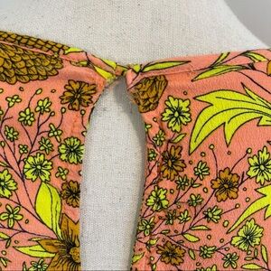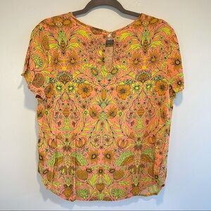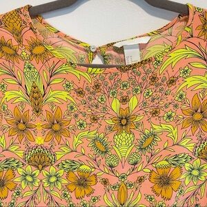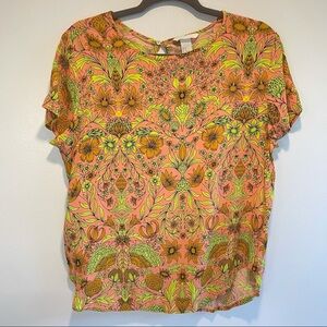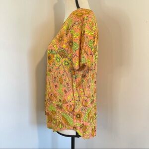 Blouse is in very good used condition. Normal signs of wear. It is in bold colors orange, yellow and like a pink color (soft neon like colors). Keyhole back. Tag reads as size 14 but I wore it best when I was a size 10/12 for a flowy fit.