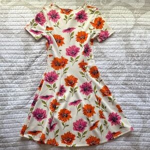 Chic mini dress with vibrant floral design. Features pink and orange flowers. Perfect for any outing.