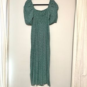 Adorable Boho Spring and summer everyday dress! Ruched Bust, A Line, Square Neck, Short Puffed Sleeves, High Waist, Slit on side of dress, Mid length!