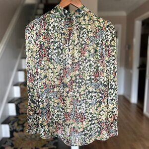 tags: H&M size extra small, sheer floral blouse, stand up collar, cottagecore, flowered, flower, meadow print, modest, dress up or down, work to weekend, office appropriate, career wear, work wear, business, meeting, conference, affordable high style, packable, wrinkle resistant, easy care, travel, trip, travel friendly, layer, dressy, modern, feminine, fashion forward, comfortable, comfort, ultra lightweight, work trip, interview, versatile, slow fashion, circular fashion, sustainable wardrobe, conscious closet