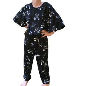 H&M Floral Open Slit Back Romper Jumpsuit 10 - shell is polyester - lining is 80% polyester/20% cotton - in great used condition. Zip back. Slit on upper part of back. Wide sleeves. Pockets.