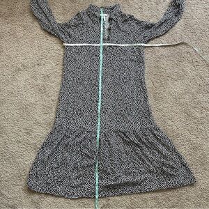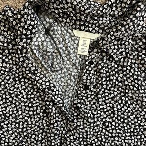 This H&M floral patterned long sleeve midi dress is a versatile wardrobe staple that blends comfort with timeless style. Designed in a chic black and white print, it features a collared neckline, 1/4 button-up front, and a flowy midi silhouette that flatters every figure. Its pull-over style makes it easy to wear, while the lightweight fabric provides effortless movement. Perfect for work, casual outings, or layering with boots and a jacket for fall and winter styling, this dress is a must-have piece that transitions beautifully across seasons. Pair it with sneakers for a relaxed look or heels for a polished vibe.