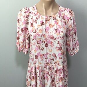 H&M Floral Pink Beige Midi Dress Drop Waist XS