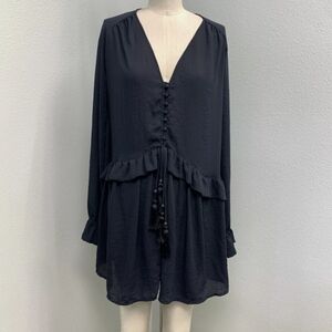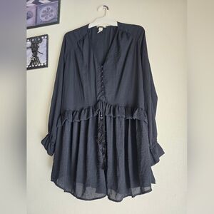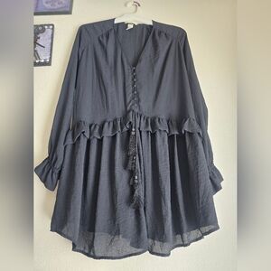 H&M Flowy Tunic Top Women's Size 2 Long Sleeve Black V-Neck Tassel Polye…