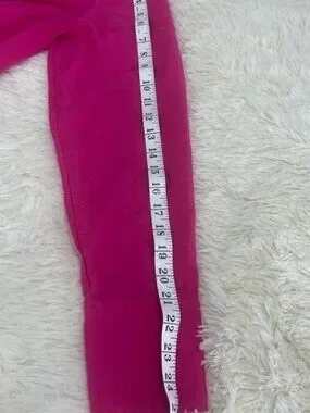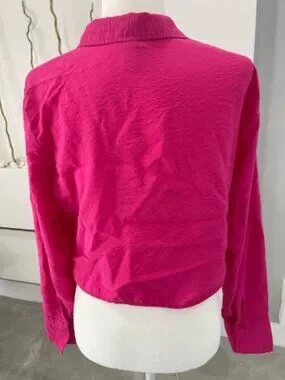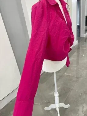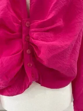 Chic fuchsia blouse with ruched front. Button-up style. Perfect for a bold look.