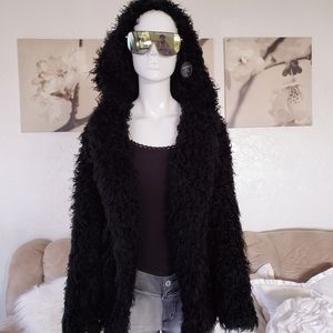 Fuzzy jacket from HM Divided brand, hooded and with faux leather trimmed pockets. One hook for closure.