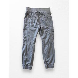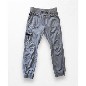 Pewter gray cargo jogger pants from H&M's L.O.G.G. (Label of Graded Goods) line. Drawstring and zipper pulls are a pastel floral. VGUG, 100% cotton.