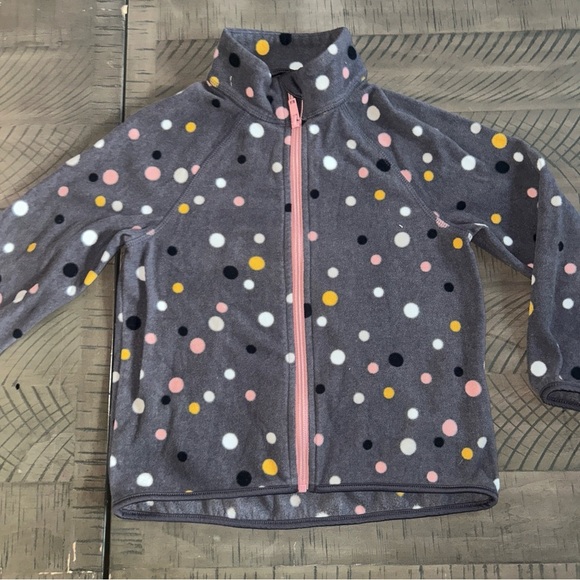 Soft gray fleece jacket with playful polka dots. Features a pink zipper for a pop of color.