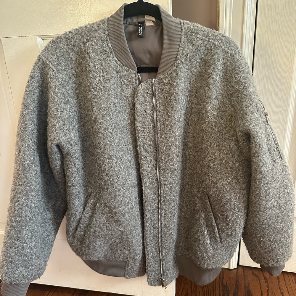 Chic gray jacket with ribbed texture. Features a sleek design and comfortable fit.