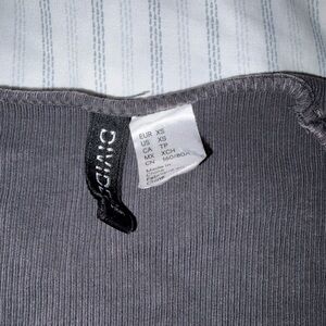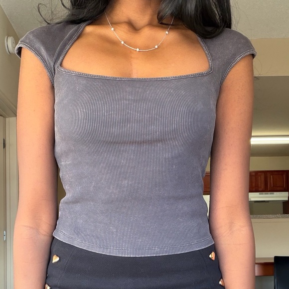 Stylish gray ribbed top paired with a sleek black skirt. Perfect for casual outings.