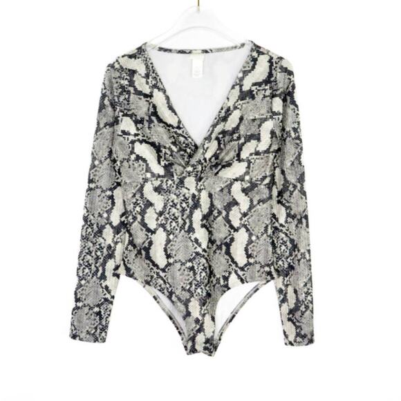 H&M Snakeskin Body Suit. Black, White, and Gray Python Print V-Neck Surplice Long Sleeve Body Suit. Flattering Fit!