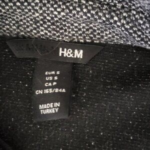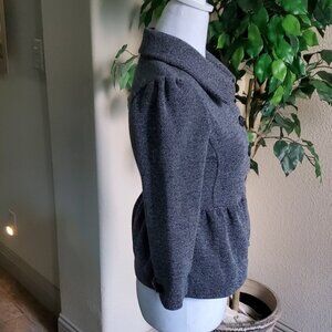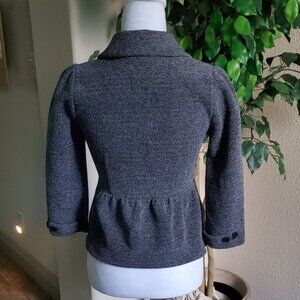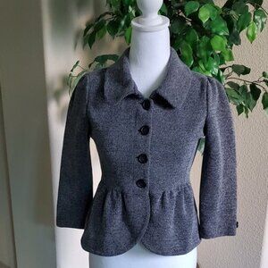 Very cute four-button gray tweed peplum blazer with 3/4 length sleeves. 51% Cotton/49% Polyester. Never worn - still has extra buttons. Size small (fitted).