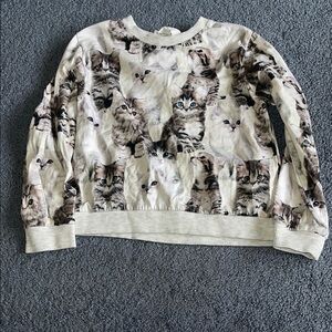 This H&M sweatshirt features a unique all-over cat face pattern in grayscale tones, offering a stylish and eye-catching look. Made from a soft fabric, it ensures comfort and warmth, perfect for casual wear. The crew neck design with ribbed cuffs adds a classic touch to this trendy top.
