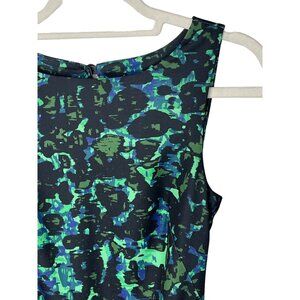 H&M midi sheath dress in green and blue abstract print. Sleeveless, slim silhouette perfect for the office or evenings out. Effortless chic with a touch of color.