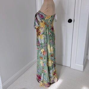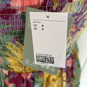 Crinkly fabric. Green with colorful floral print. Ties halter style behind neck. Smocked bodice. Cut out detail. Lined. NWT