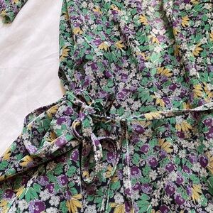 Chic long sleeve dress with floral pattern. V-neckline and elegant fit. Ideal for versatile styling. Wrap style with ties. Ruched sleeves. In great condition, no flaws.