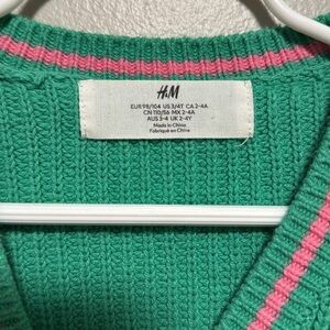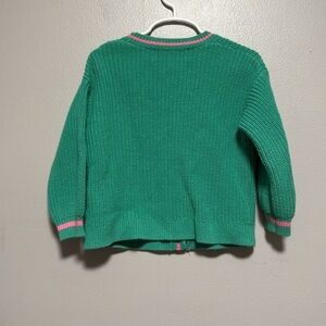 Charming green kids cardigan featuring playful pink accents and fun patches. Perfect for adding a pop of color to any outfit.