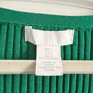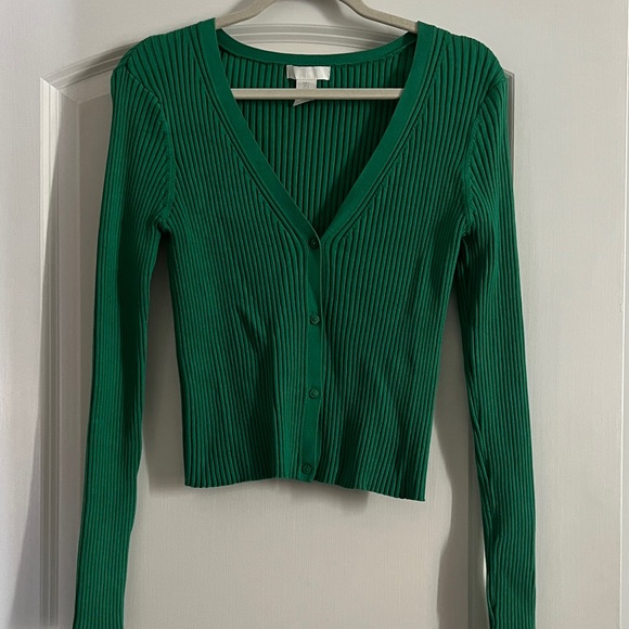Stylish ribbed sweater. V-neck design. Button-up front. Long sleeves.