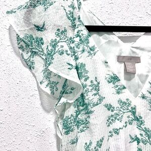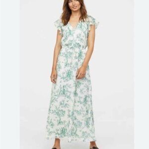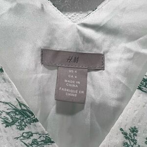 Embrace this preworn, fresh look with this H&M sundress, showcasing a delightful green and white floral pattern. The dress features a flattering V-neckline and charming cap flutter sleeves, perfect for a wedding guest or a casual resort outing. Its flowing silhouette and lightweight fabric ensure comfort and style for any occasion.