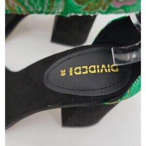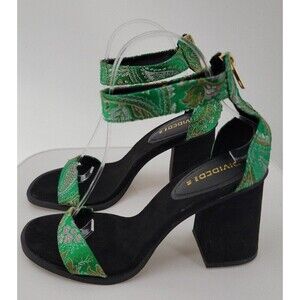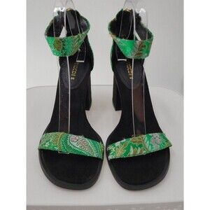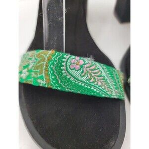 Sandals with zip at back, ankle strap, and covered block heels. Faux suede insoles and rubber soles. Heel height approx. 3 1/4 in.