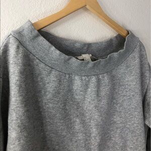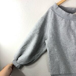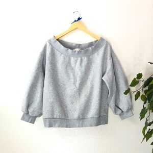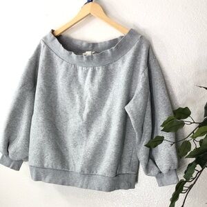 A super cute cropped sweatshirt with 3/4 sleeves. A little heavy weight and very slight pilling from wear. Still super comfy and can be worn off the shoulder.