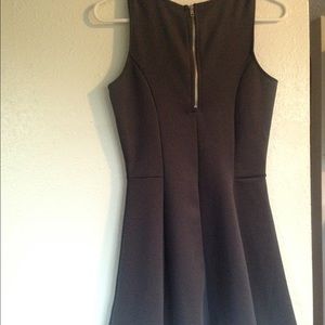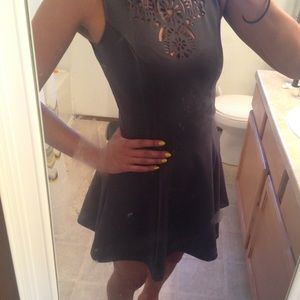 Awesome and comfortable dark grey dress with beautiful laser cut pattern on chest. Worn once! Scuba-ish material that won't wrinkle. Very flattering and comfortable. Hid my stomach pooch perfectly for a wedding. It was like wearing spanx.