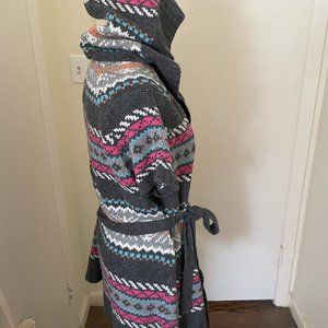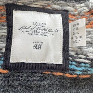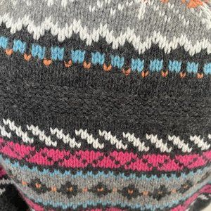 Grey sweater with fantastic light blue, white, pink, and orange design