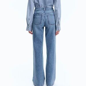 Gorgeous high-rise wide-leg denim with that perfectly relaxed but elevated look. Medium blue wash with subtle fading, structured denim, and a long, flowy leg that elongates your silhouette. Super flattering through the waist and hips while giving that effortless, on-trend fit.