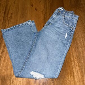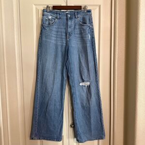 H&M Harper High Rise Wide Leg Jeans in Light Stonewash. Features 5-pocket jeans in washed cotton denim, High waist, zip fly, button closure, straight, & wide legs. In good condition.