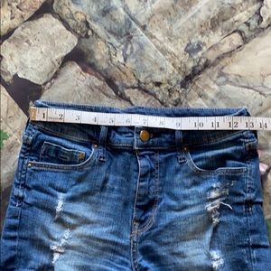 Nice pair of used high rise distressed jean shorts from H&M. No stains or flaws. Size 4 see measurements in photos.