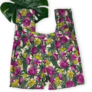 Super cute, lightweight woven high-waisted pull-on pants from H&M in a lush tropical botanical floral print of dahlias & lilies.