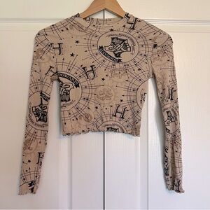 Hogwarts themed long sleeve top with celestial design. Features black and brown graphics on a cream background.