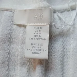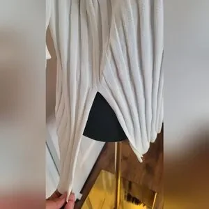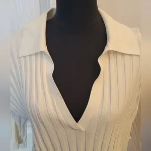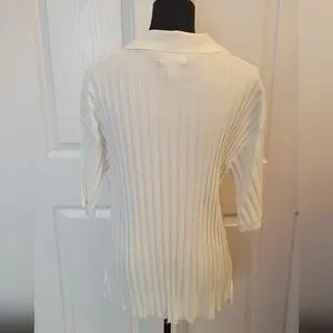 Elegant ivory blouse with ribbed design. Features a collared V-neck and half sleeves. Perfect for any occasion. Box#4