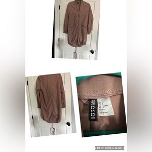 This jacket is a mauve shade of pink. It zips up and has two front pockets and a cute tie detail on the back.