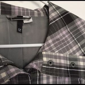H&M jacket, Color: gray/purple plaid. Wide color, Size 12 but fits like an 8-10 depending on chest size.