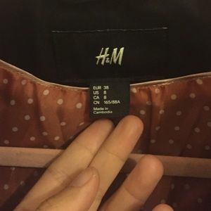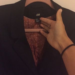 Black H&M jacket with 3 buttons in front & 3 black buttons on bottom of each sleeve. Can be worn buttoned or unbuttoned for a more casual look. Beautiful brown and white polka dot satin feel material inside. Gently worn. No fading, rips or stains.