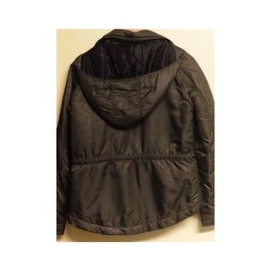Dark olive color, light puffer style jacket. Gently used and in excellent condition.