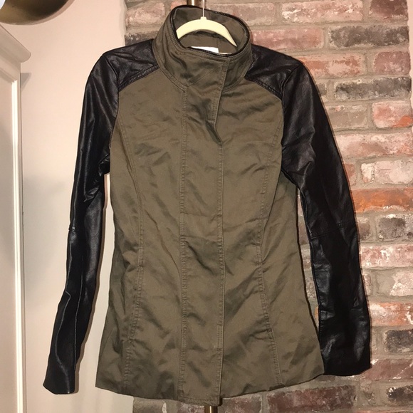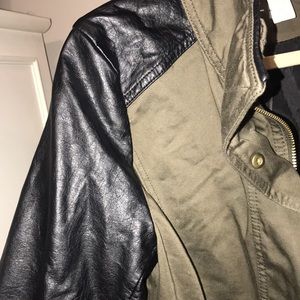 Cargo army green jacket with faux leather accent sleeves. Can be zipped all the way up to the neck. Worn only a few times. Size medium.