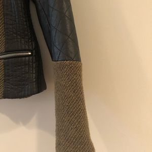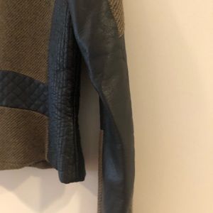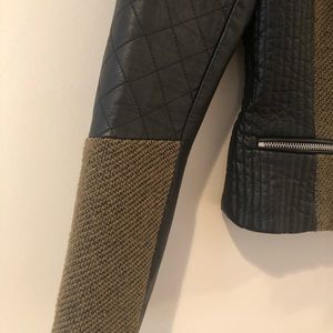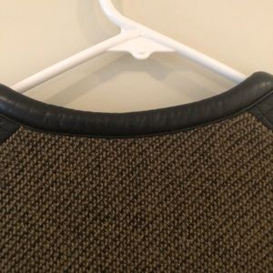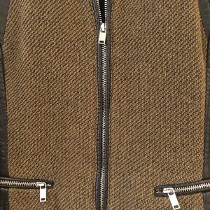 Gorgeous moto /vintage style jacket! The body looks like a tweed ( brown, tan, khaki greenish) woven material and is edged with a faux leather. No wear spots at all! Barely visible pilling in some areas. Size shows US 10 and is closer to a small, maybe a larger small. Measurements: 20 1/2 from shoulder to bottom and 15 underarm to underarm.