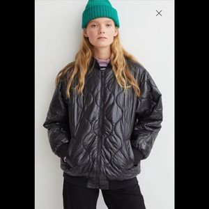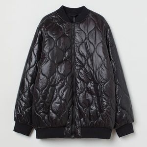 Oversized, lightly padded jacket with quilting. Low stand-up collar, zipper at front, and welt front pockets. Dropped shoulders, long, wide sleeves, and ribbing at neckline, cuffs, and hem. Lined.