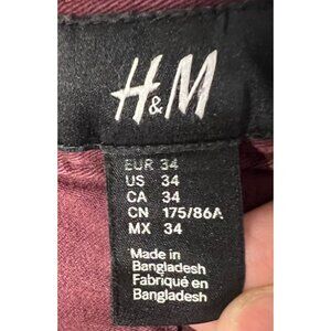 Stylish burgundy H&M jean shorts, size 34. Crafted in Bangladesh with a five-pocket design, zip button closure, and measurements: 17" waist, 11" rise, 10" inseam, and 20" hips.