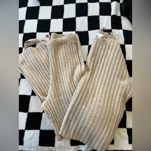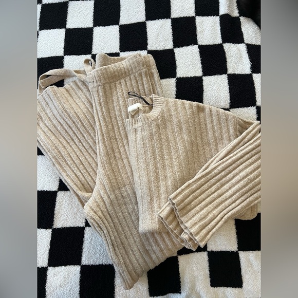 Tan/Beige knit set. It’s super cute and I loved wearing it. I have worn it many times but still has some life in it. I’m just ready to rotate it out. Super cute with snow boots and an oversized denim jacket. Both size small.