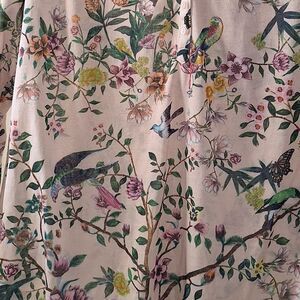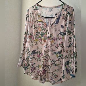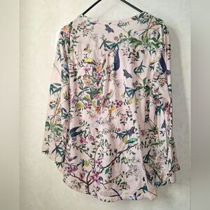H&M Large, top, light pink blouse with floral print, v-neck, semi sheer, long sleeve, Breezy polyester 24" long, 42" bust, casual, BOHO, femenine