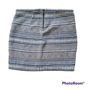 This is a beautiful skirt from H&M L.O.G.G. It features a zip up the back, blue and white aztec print, and is a thicker material. Slightly stretchy, this will hug all the right curves! A little longer in the back for a bit more coverage as well. In fantastic condition!