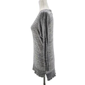 Lightweight pullover V-neck knit sweater - shade of heather gray. Back is slightly longer than front. Fitted 3/4 length sleeves. Material has a stretch. 60% Cotton, 30% Modal & 10% Linen.