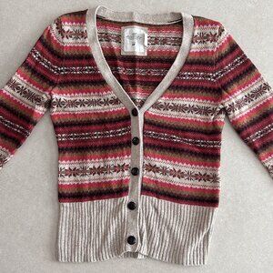 "Soft, jacquard-knit cardigan with a V-neck and buttons down the front."