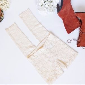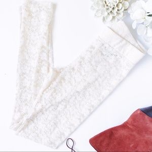 These are the most beautiful leggings! They can really add almost a beautiful romantic touched any outfit this fall! These leggings are sheer. Completely shared throughout from top to bottom. Perfect to wear under address like a stocking. 50% polyester 39% polyamide 11% elastine. L 30 8W 11 inseam 29 1/2. Stock 21–33