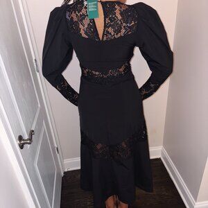 Long-length dress in taffeta made from recycled polyester with inset sections in lace. Round neckline, an opening with a covered button at the back of the neck and long sleeves with puffy draping at the shoulders for a dramatic silhouette. Gently flared, softly draping skirt and a concealed zip in one side.